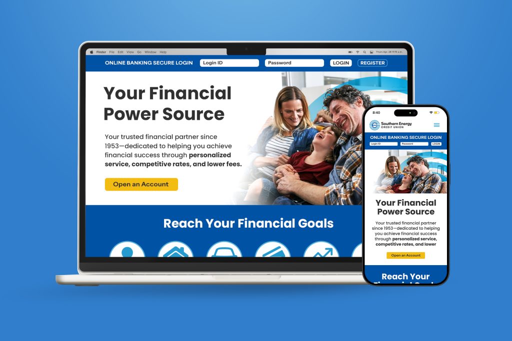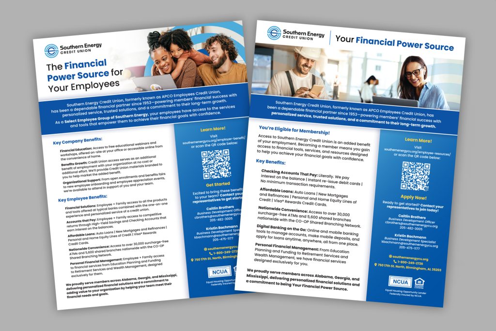 We applied the new brand identity across a wide range of assets, including banners, brochures, debit cards, signage, and social media graphics. The rebrand culminated in the launch of a redesigned website that reflects the fresh look and expanded capabilities of Southern Energy Credit Union.