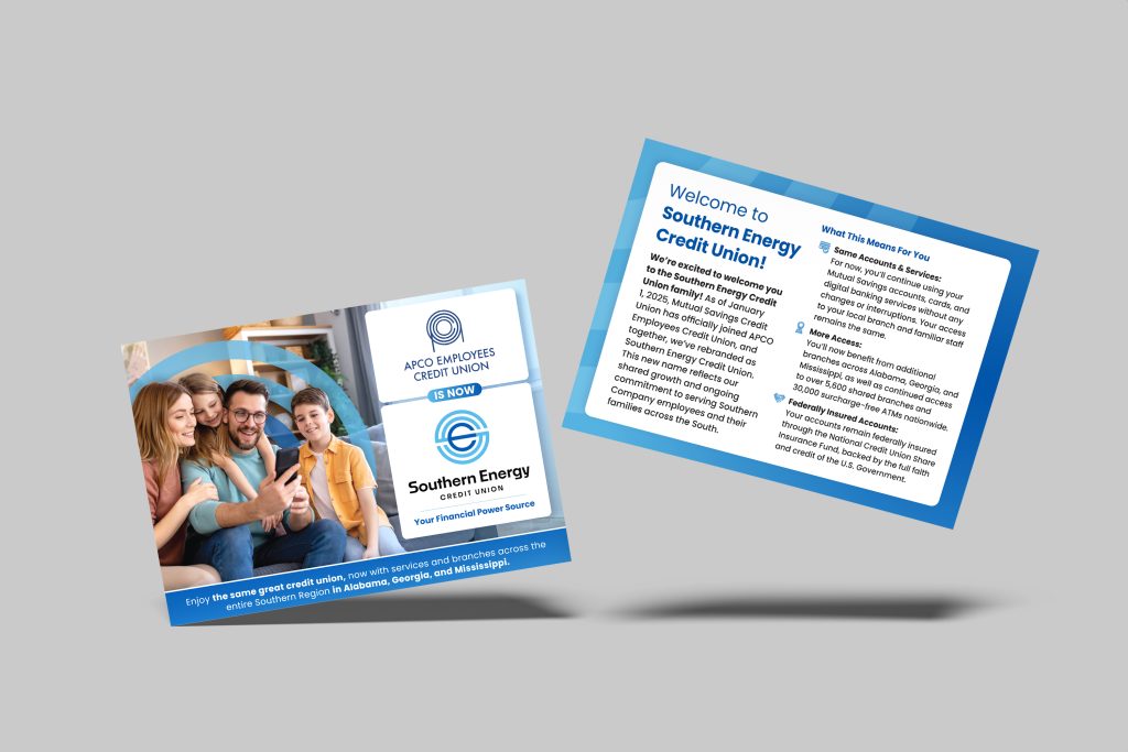 Following a major merger, Southern Energy Credit Union, formerly known as APCO Employees Credit Union, enlisted Vibrant Brands to lead a strategic rebranding initiative aimed at unifying their brand identity, honoring their history, and positioning them for future growth.